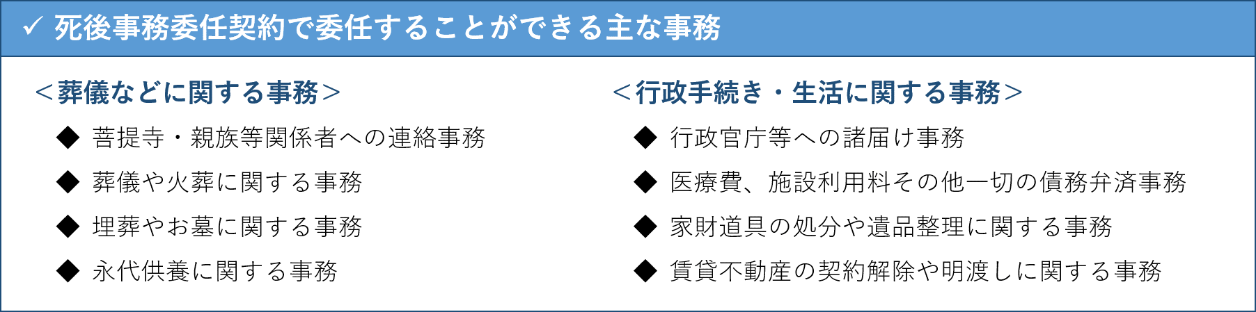 死後事務委任契約とは、ご自身の死後に行わなければならない事務を第三者に依頼しておく契約です。